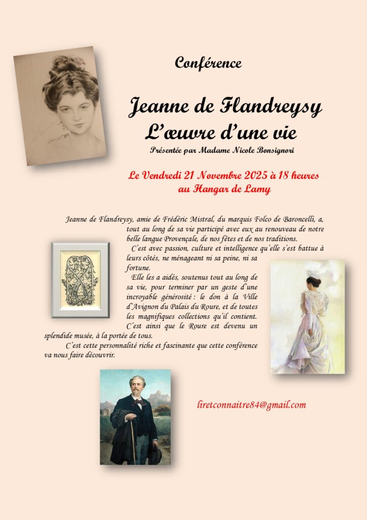 Nicole Bonsignori donnera une conférence sur le thème : Jeanne de Flandreysy, l'œuvre d'une vie (une personnalité fascinante, amie de Frédéric Mistral et du marquis de Baroncelli)