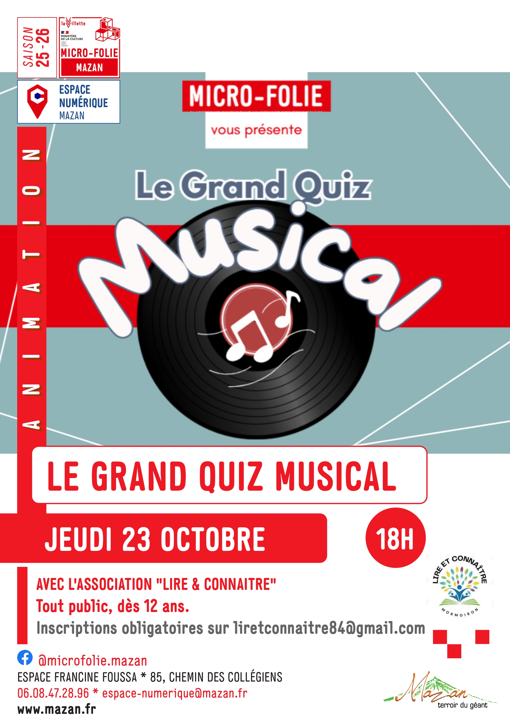 L'Espace Numérique de Mazan en association avec l'association Lire et Connaître de Mormoiron vous présente Le Grand Quiz Musical. Inscriptions obligatoire à liretconnaitre84@gmail.com